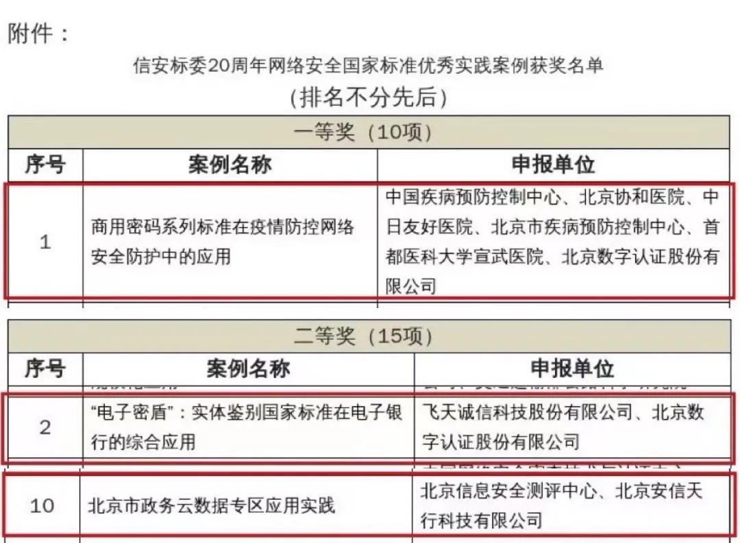 日前,“网络安全国家标准20周年优秀实践案例评选活动”获奖名单正式对外公布。经过主办方全国信息安全标准化技术委员会(以下简称“信安标委”)的专业评审和激烈角逐,北京数字认证股份有限公司(以下简称“数字认证”)申报的《商用密码系列标准在疫情防控网络安全防护中的应用》荣获一等奖,此外《“电子密盾”:实体鉴别国家标准在电子银行的综合应用》以及子公司北京安信天行科技有限公司《北京市政务云数据专区应用实践》分别荣获二等奖。不论是获奖数量,还是奖项含金量,均位列本次入围单位前列。