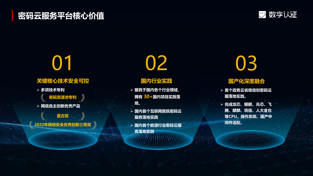 密码云服务平台基于安全可控的关键核心技术为支撑,通过对密码资源进行虚拟化管理,提供证书服务、密钥管理服务、加解密服务、签名验签服务等覆盖业务全场景的密码服务支撑。产品已获多项技术专利,并获得了网信自主创新优秀产品及2022年网络安全优秀创新奖等在内的多种奖项。密码云服务平台采用标准国密算法、国密协议,遵循国家颁布的政策法规及密码行业标准,支持适配多款信创生态环境,已完成了龙芯、鲲鹏、统信等多个国产CPU操作系统及中间件的适配,支持了国内首个互联网医院密码云项目、首个能源行业密码云服务项目、首个政务云省级信创密码云服务项目等30+行业及项目的实践落地。