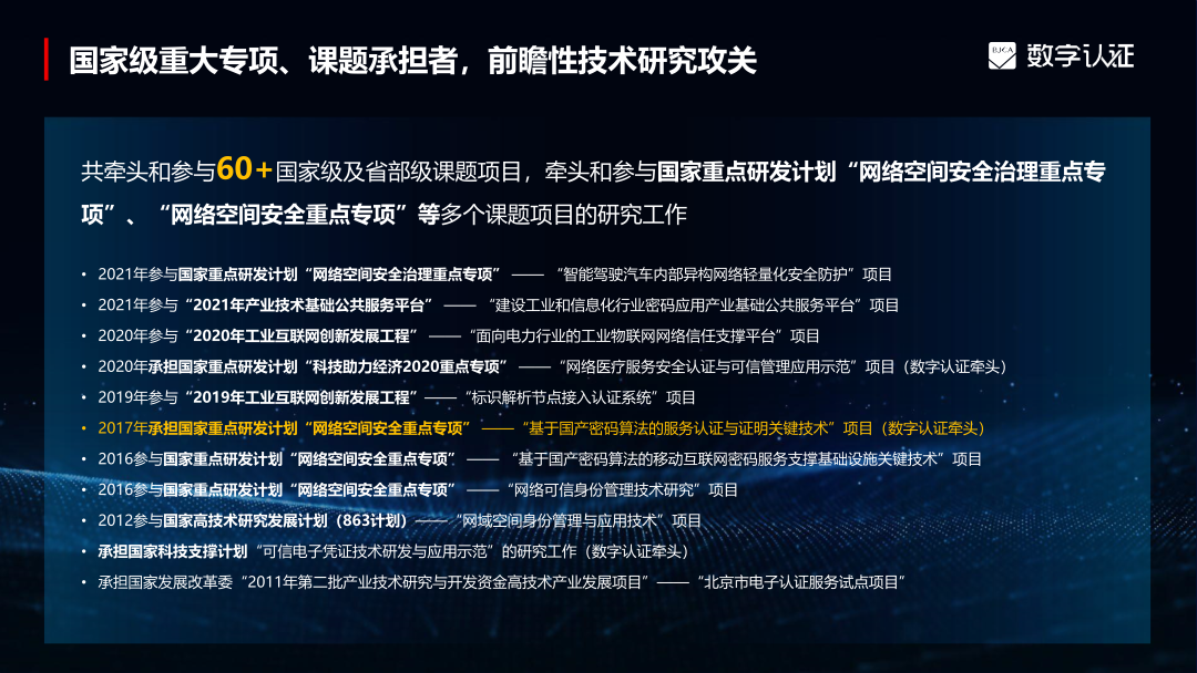 密码技术是保障数据安全和信息化现代化建设平稳运行的基础支撑。近年来,数字认证牵头参与了60+国家级及省部级的课题项目,参与了180+项国家标准、密码行业标准、地方标准和团体标准的制定,先后获得了北京市科学技术奖、密码科技进步奖、保密科技奖等多种国家级重要荣誉。