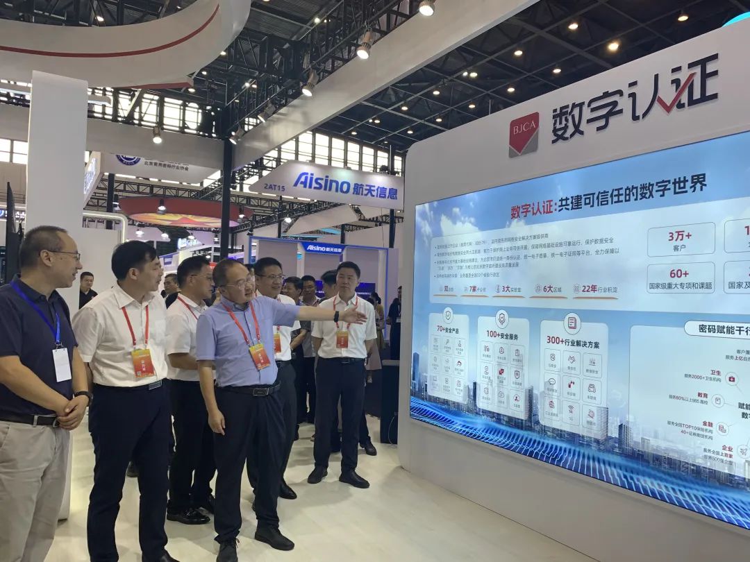 来自国家密码管理局及各省市密码局相关领导纷纷莅临数字认证展台参观指导,数字认证董事长詹榜华、总经理林雪焰陪同交流。
