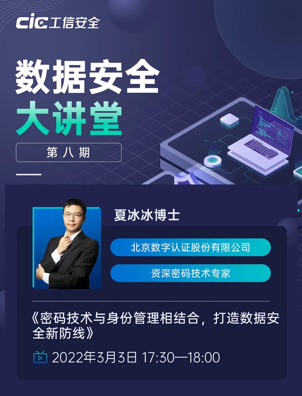 2022年3月3日,由国家工业信息安全发展研究中心主办的 “数据安全大讲堂”准时在线开讲。北京数字认证股份有限公司的资深密码技术专家夏冰冰博士也应邀带来了《密码技术与身份管理相结合,打造数据安全新防线》的重磅课程,引发众多网友线上热议。