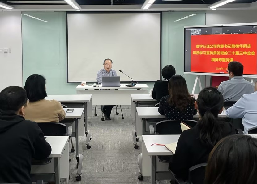 为深入学习贯彻党的二十届三中全会精神,深刻领会和把握进一步全面深化改革的主题、重大原则、重大举措、根本保证,引导全体党员将思想和行动统一到党中央决策部署上来。11月21日,数字认证公司党委书记詹榜华为全体党员讲授了一堂生动的专题党课。